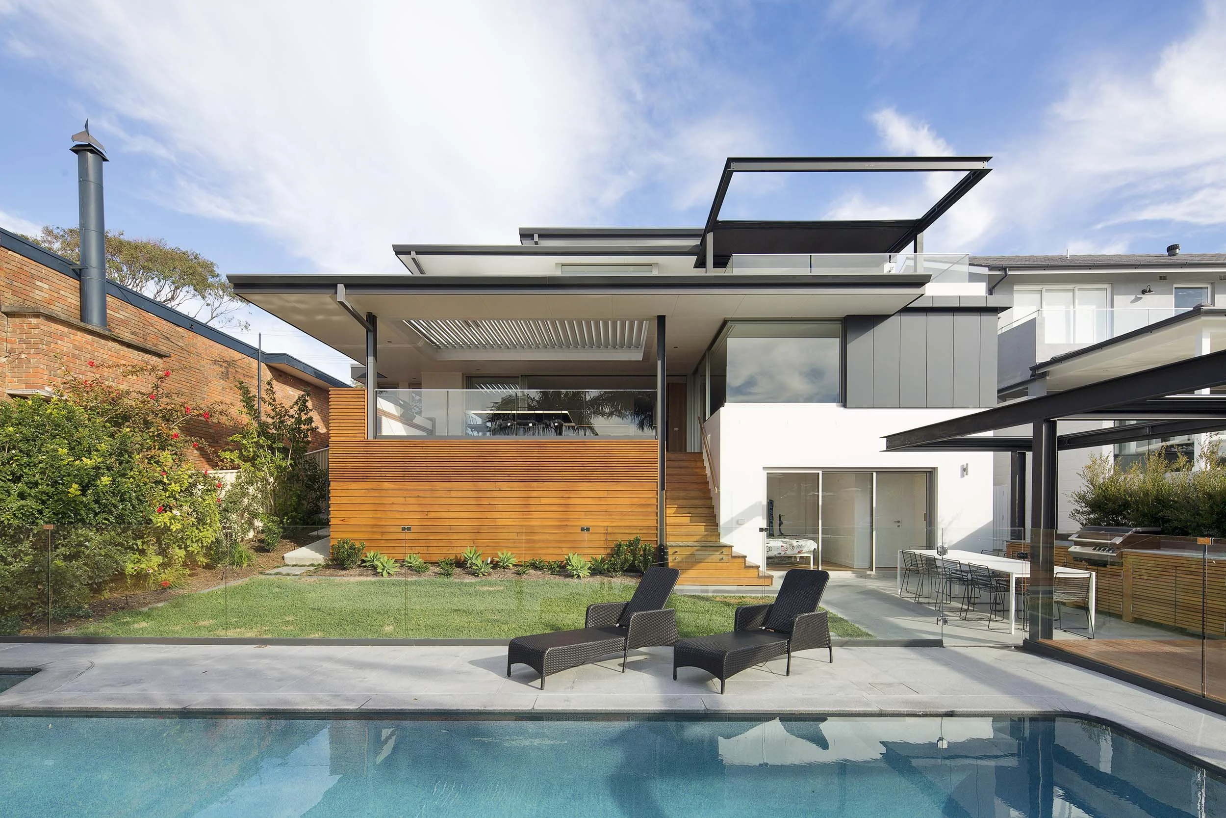 A major transformation to connect and enlarge living areas, create functional outdoor terraces and revitalise all areas of this large family home. Existing brickwork was rendered, new windows were installed throughout, including large sliding doors to connect the kitchen to the adjoining terrace with new operable roof. Elsewhere outdoor entertaining areas include retractable blinds in steel frames to create comfortable living spaces.